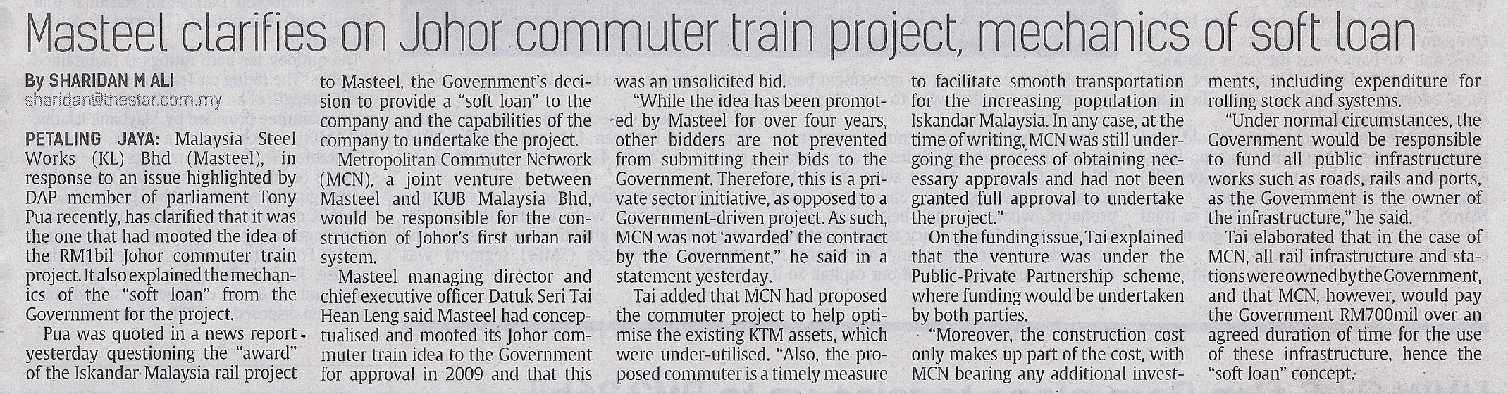 Masteel clarifies on Johor commuter train project, mechanics of soft loan